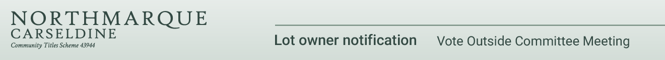 The Secretary for the Body Corporate for Northmarque (CTS 43944) has issued a Vote Outside of Committee Meeting (VOCM) to the committee for their decision. The details of this VOCM appear below. No action is required from Lot owners, this message is for your information only.